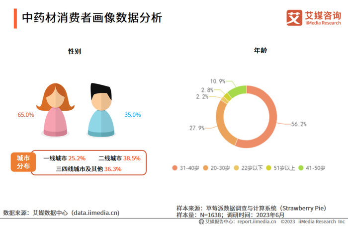 iiMedia Research (艾媒咨询)数据显示,受访用户中,女性用户占比更多,约为65.0%,且用户的年龄主要在31-40岁,占比56.2%。艾媒咨询分析师认为,中药的受众群体不再局限于51岁及以上的居民,随着国家对中药的宣传推广,越来越多年轻人购买中药材。女性在日常生活中更注重健康和美容,中药材被认为是一种自然、有效和健康的美容和调理产品,女性消费者成为中药材的重要消费群体。