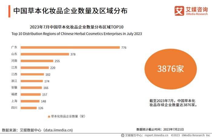 iiMedia Research(艾媒咨询)数据显示,截至2023年7月,中国草本化妆品存续企业数量达3876家。广东、山东、河南、江苏、江西的草本化妆品企业数量位列前5,分别为776家、378家、255家、220家、182家。
