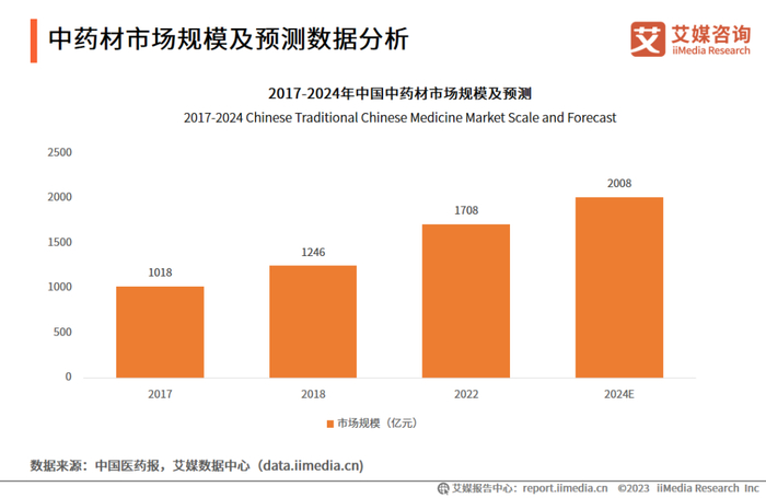 随着居民消费水平的提升和健康保健意识的增强,总体健康需求在扩大,进而推动中医药市场的发展。iiMedia Research(艾媒咨询)数据显示,2022年中国中药材市场规模达到1708亿元,预计2024年将超过2000亿元,中药材市场规模扩大前景可观。