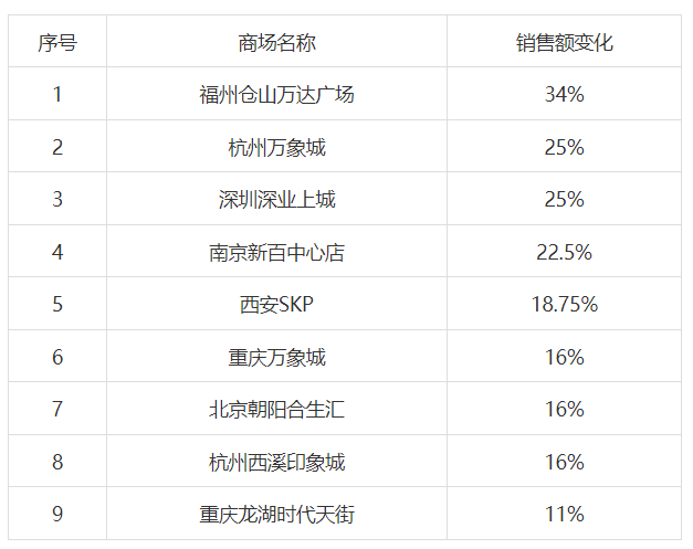 | 序号 | 商场名称 | 2022销售额 | 2021销售额 | 销售额变化 |