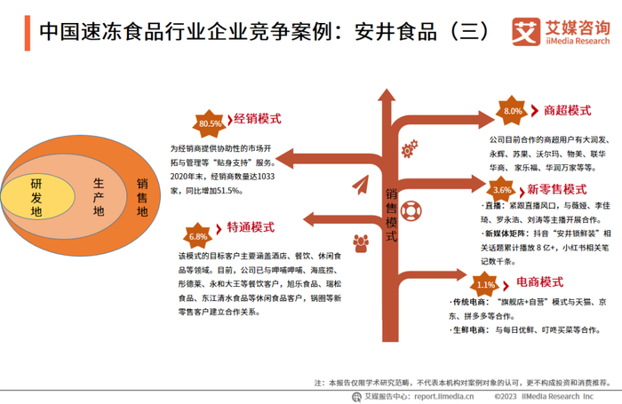 安井食品重视销售网络的布局与打造,目前已经构建了经销、商超、特通、电商与新零售相结合的销售模式,并提出围绕销售地建立配套的生产与研发设施,为达到一定规模的销售辖区建立“销地产”的工厂基地建设模式以及“销地研”的销售研发策略。其中,经销模式仍然是最主要的销售模式,电商模式营收占比最小。