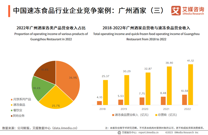 数据显示,近年来广州酒家的总营收与速冻食品营业收入不断增长。2022年,广州酒家营业收入达41.12亿元,速冻食品营业收入为10.58亿元,占总营收的25.7%,仅次于月饼系列产品所占比重。广州酒家近年来加大速冻食品业务的开展,而速冻食品业务也提供了较好的营业收入。