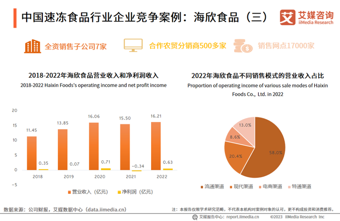 海欣公司销售模式以流通渠道为主,现代渠道、特通渠道和电商渠道为辅。公司与沃尔玛、永辉、大润发、家乐福、华润万家、麦德龙等著名连锁超市,社区便利店以及张亮、海底捞、杨国福等连锁客户均有所合作。2022年,公司营业收入增长至16.21亿元,同比增长4.59%;2022年净利润实现扭亏为盈,达到0.63亿元。