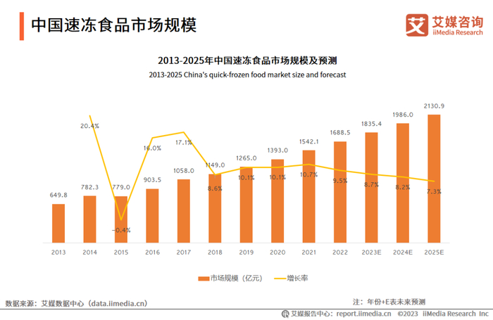 iiMedia Research(艾媒咨询)数据显示,中国速冻食品市场规模不断扩大,2022年中国速冻食品市场规模已达1688.5亿元,预计2025年将达2130.9亿元。随着餐饮端对半成品食材的需求日益增强,半成品食材兴起丰富了速冻食品市场,赋予速冻食品行业新的发展机遇。