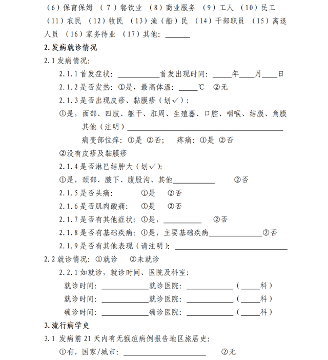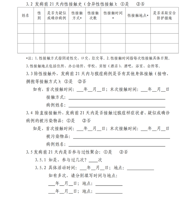 2.疑似病例。猴痘样症状者,发病前21天内具备以下流行病学史中的任何一项:(1)有猴痘病例报告地区旅居史;(2)有猴痘确诊病例或疑似病例接触史;(3)有同性性行为,或性伴有同性性行为史;(4)有地方性流行区可疑动物接触史。