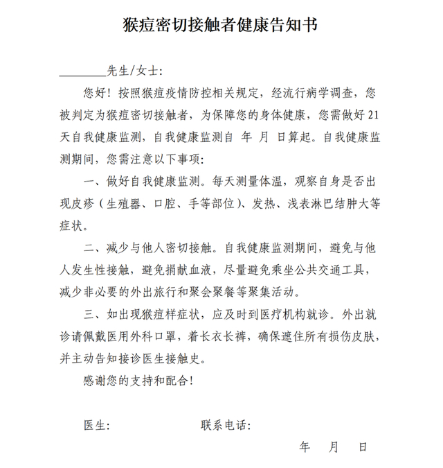 密切接触者自我健康监测期间可正常生活与工作,需避免与他人发生性接触等密切接触,避免捐献血液等;坚持每天做好体温测量和症状监测,出现猴痘样症状应及时就诊并主动报告可疑接触史。辖区疾控机构或基层医疗卫生机构应在密切接触者自我健康监测第7、14、21天上门或电话对其进行随访,提供咨询指导,发现异常情况及时进行处置。