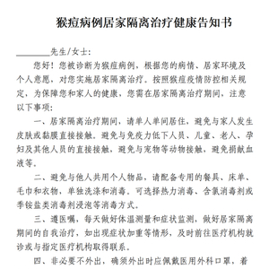 各地发现猴痘疑似病例和确诊病例应当及时转运至医疗机构进行隔离治疗,如临床症状明显好转,病变部位已结痂,可转为居家隔离治疗,直至皮疹结痂自然脱落,解除居家隔离。对病情较轻且具备居家隔离治疗条件的确诊病例,经医疗机构与疾控机构联合评估后,可直接采取居家隔离治疗。对于实行居家隔离治疗的确诊病例发放《猴痘病例居家隔离治疗健康告知书》(见附件2)。确诊病例居家隔离治疗期间,单人单间居住,避免与家人有皮肤或黏膜直接接触,做好被污染物品的消毒,非必要不外出,确须外出时穿长衣长裤、佩戴医用外科口罩,避免前往人群聚集场所,避免与其他人有皮肤或黏膜直接接触;指定医疗机构安排专人负责上门或电话随访,提供健康咨询和医疗指导。