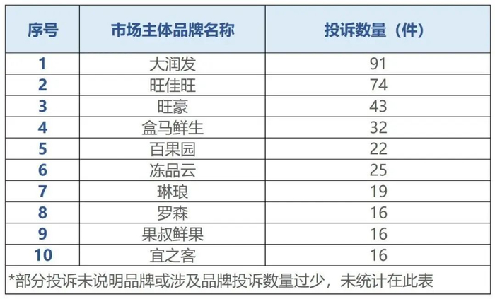 被投诉较多的品牌是大润发、旺佳旺、旺豪、盒马鲜生、百果园、冻品云、琳琅、罗森、果叔鲜果、宜之客。