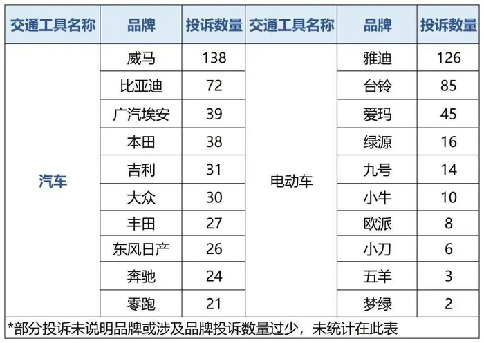 交通工具类:威马、雅迪等20家汽车、电动车品牌被投诉较多