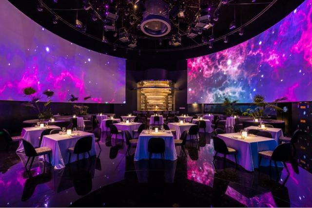 当用餐区大门缓缓拉开,眼前环绕的LED大屏幕,配合穹顶的点点“星光”,让人仿佛化身为一颗宇宙粒子般身临其境。据了解,屏幕中的“星寰号”采用裸眼3D的效果呈现,带领食客于“无尽星寰”中穿梭,感受地球以外的“美食文明”。而LED屏幕的对侧,设计了一个酒吧区域,在星辰的包围下,酒吧暖色的灯光如同浩瀚宇宙中的灯塔,给人一种宁静恢弘的视觉感受。