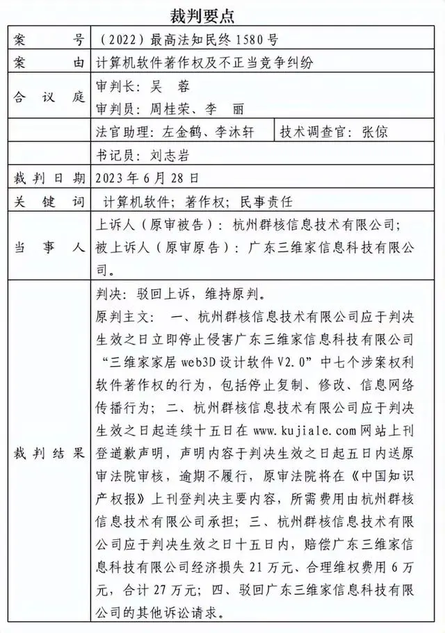 根据三维家公开的终审判决书节选内容,法院判定,群核科技侵害了三维家“web3D软件V2.0”中7个涉案权利软件著作权,要求群核科技在官网刊登道歉声明,并赔偿27万元。