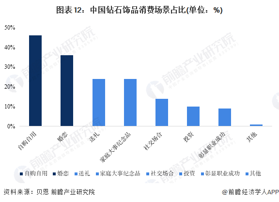 中国消费者更愿意购买钻石饰品来取悦自己。根据贝恩咨询,中国钻石饰品消费场景结构中,自购自用为占比最大的部分,达46%,其次为婚恋场合。自购自用的消费场景体现出较强的自我驱动性,相比于外部因素驱动的婚恋、送礼、家庭大事纪念品等场合,自购自用消费场景占比大在一定程度上可以说明未来中国钻石饰品市场的增长动能较大。