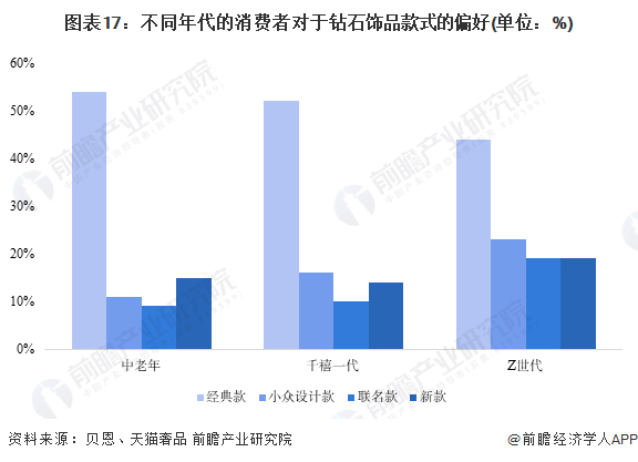 90%的Z世代消费者认为,公司有责任应对环保和社会问题,良好的消费意识与《金伯利进程》共同推动钻石行业更加规范的发展。此外,相比于中老年,千禧一代以及Z世代对于钻石款式的偏好逐渐由经典款转移至小众设计款、联名款以及新款,更追求款式个性以及创新力。