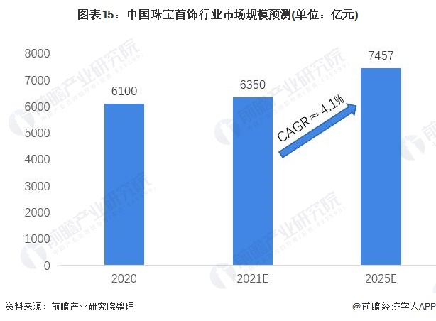 根据中国珠宝玉石首饰行业协会数据,2020年我国珠宝市场规模约为6100亿元。在消费升级、经济中高速发展的大背景下,人均可支配收入不断增加,消费升级成为长期趋势,未来我国珠宝首饰行业市场规模也将得到稳定提高,预计2021年将达到6350亿元,2025年可达7457亿元,年均复合增长率约为4.1%。