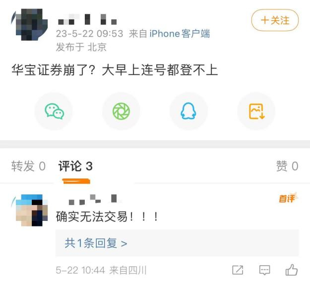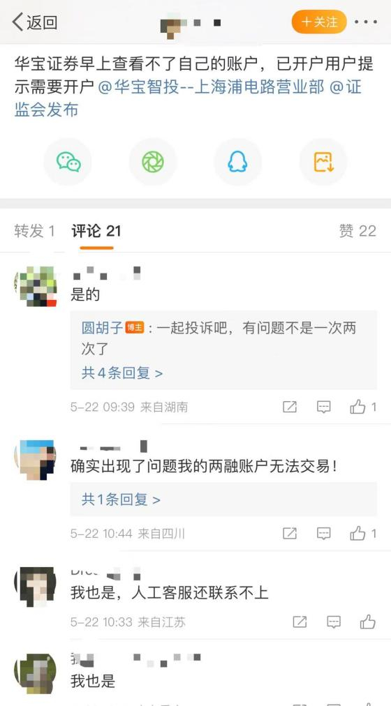 券商中国记者检索社交网络发现,今年5月22日上午,确实有一部分投资者在网络上反馈,华宝证券APP出现异常,无法登录或交易。