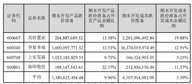 与行业对比中来看,2022年末,海印股份期末开发产品跌价准备余额为1.98亿,占开发产品余额比例为22.37%,行业均值为9.96%,可比公司的首位;期末开发成本跌价准备余额为2.13亿,占开发成本余额比例为11.57%,行业均值为5.39%。