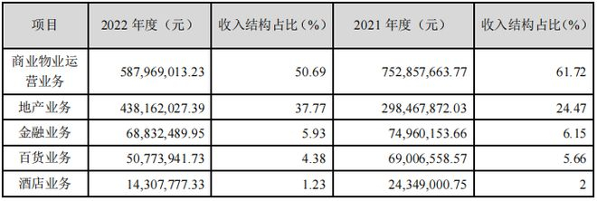 2022年末,公司营业收入中商业物业租赁业务收入为4.88亿,占比达到50.69%;地产板块业务收入为4.38亿,占比37.77%;金融业务收入为0.69亿,占营业收入的比重为5.93%。
