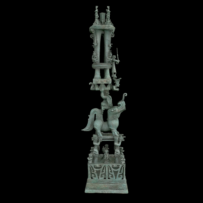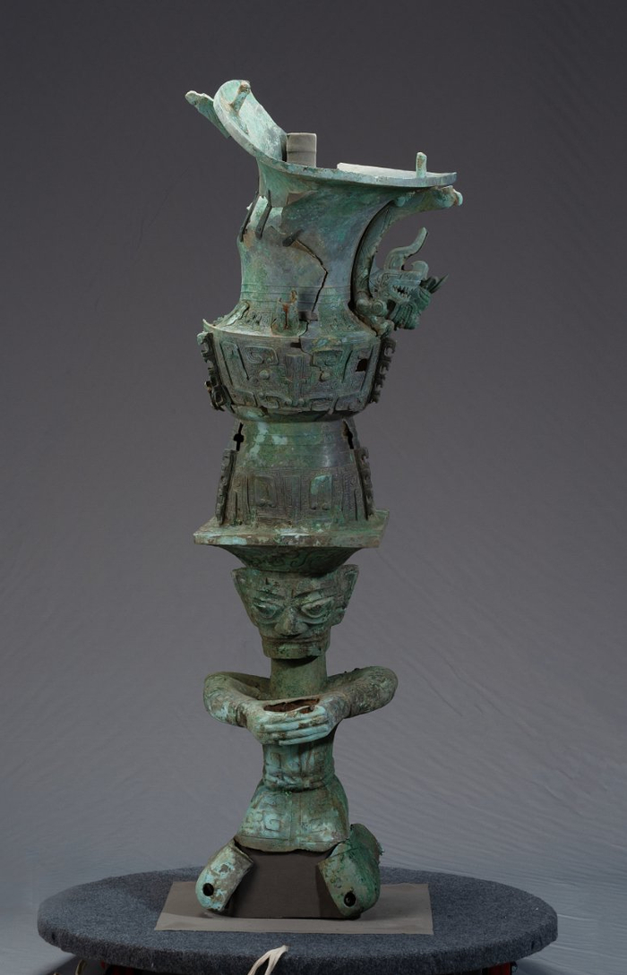 通高2.53米,由三星堆遗址祭祀区8号坑出土的青铜顶尊神像、青铜持龙立人像、青铜杖形器,三号祭祀坑出土的青铜罍、青铜龙形尊盖,二号祭祀坑出土的青铜鸟足人像拼合而成。文物尚未修复,目前分开展陈。