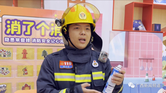 南宁市消防救援支队特勤二站消防员 黄日宙:市面上的防晒喷雾成分,里面含有变性乙醇、丁烷、异丁烷等可燃物,遇到火就会燃烧。