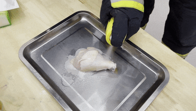 在另一组实验中,消防员在鸡腿上喷洒了大量防晒喷雾,等待大约20秒后再进行点火,鸡腿却没有被点燃。
