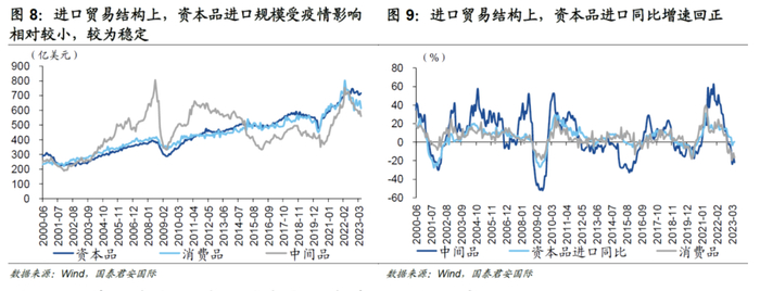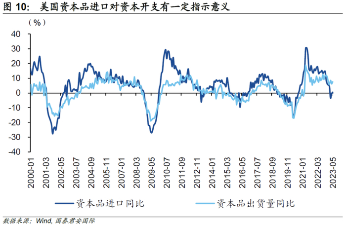 其二,进口贸易特征同样指向美国制造业“回流”。贸易结构与产业结构存在长期耦合关系,两者的变化方向通常是一致的,因而贸易结构可以作为判断产业结构发展趋势的重要依据。那么,从进口商品贸易特征来看,相较中间品和消费品,美国资本品进口受疫情影响相对较小,其规模较为稳定。截至2023年6月,资本品进口同比增速小幅回升,并由负转正。由此,资本品利于资本的积累,边际回稳的资本品进口或指向美国企业资本开支可能会重新加速。