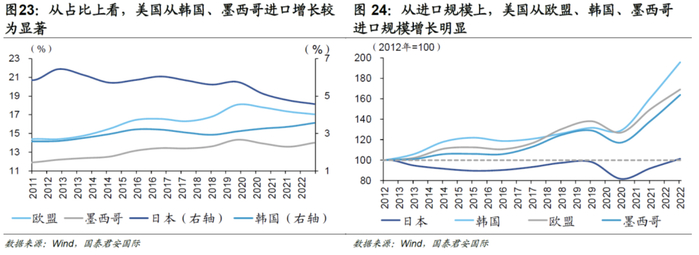 从已知数据来看,部分经济体似乎与美国供应链关系更加紧密。美国制造业回流是对不同要素密集水平的产业链进行优化与重构,发挥自身技术密集型、资本密集型的优势,而将劳动力密集型以及产业积聚度偏低等相对劣势产业“让渡”至其他经济体。目前而言,欧盟、墨西哥、日本、韩国等与美国供应链的关系更加紧密。从国别进口的占比来看,美国从墨西哥、韩国的进口占比的增长十分显著。从进口规模来看,以2012年美国从各国进口规模作为基准(设定为100),2022年美国从墨西哥、韩国以及欧洲进口占比指数为164、196、169,进口规模增长显著。