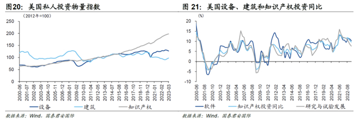 产业结构上,制造业“回流”的产业集中在高新科技领域。从外资“回流”的行业流向看,外商直接投资更青睐美国的电气设备、计算机电子和机械设备。这与拜登政府的“重建美国制造业”相关法案中的“加强科技领域管制”、“注重供应链稳定”行业主线相印证。从私人固定资产投资看,美国知识产权投资维持较高水平,新技术创新投入持续加大。