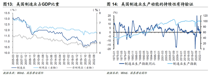 总量层面,美国制造业“回流”速度并不快。增加值方面,美国制造业增加值占GDP比重仍处于历史低位,制造业回流是相对缓慢的过程。产出方面,随着美国供应链修复,美国生产能力已恢复至疫情前水平,但制造业生产指数同比增速转负,后续制造业生产动能的持续性有待验证。