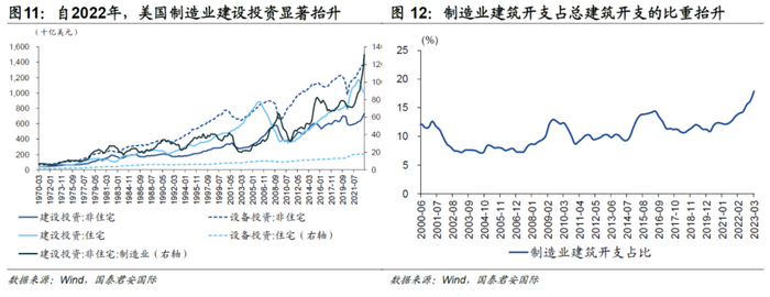 其三,制造业建设支出明显加速,印证制造业“回流”。疫情以来,制造业建设支出的增速尤为强劲,2023年一季度的增速高达49%,而2022年以来的年均增速超30%。反观支出规模,制造业建设支出体量相对偏小,约占非住宅建设支出的17%左右,但这一比重自2018年以来明显抬升。