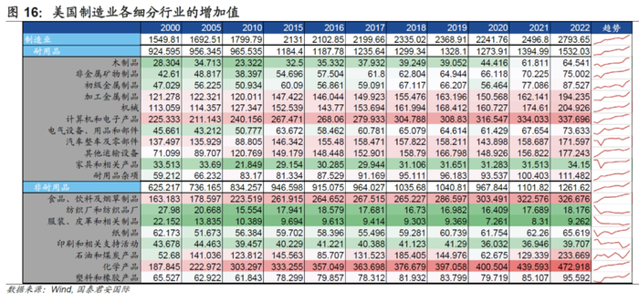 从疫后行业修复看,随着全球供应链产业链修复,美国制造业各细分行业均有所修复,增加值同比增速显著抬升。其中,石油煤炭行业、初级金属、加工金属、机械、运输设备、服装、塑料制品行业2022年增加值恢复较快,但这更多是对前期疫情压制部分的回补以及高通胀的价格因素扰动。反观受疫情影响相对较小的细分行业,如非金融矿物、计算机以及电子、纸制品等,这类行业的增加值回升速度相对平稳。