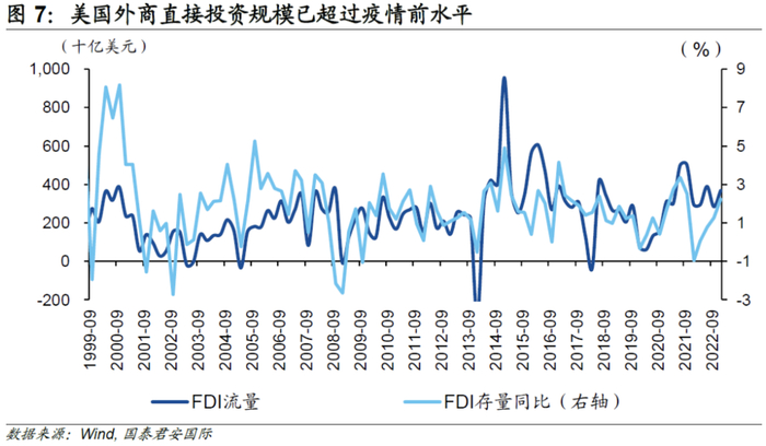 产业政策显效,美国制造业“回流”迹象明显。其一,外商对美国的直接投资可以直观反映外资回流美国的状况。2022年以来,流入美国的外商直接投资明显提速,美国成为资金青睐的目的地之一。其二,进口贸易特征同样指向美国制造业“回流”。其三,疫情以来,制造业建设支出的增速尤为强劲,印证制造业“回流”。