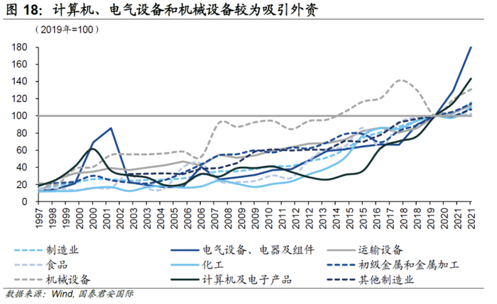 美国制造业回流并不一定要回补短缺的低端制造业,而是美国政府对不同要素密集水平的产业链进行优化与重构,回流领域集中在高技术产业。从外资“回流”的行业流向看,外商直接投资更青睐美国的电气设备、计算机电子和机械设备。2021年美国制造业各细分行业外商直接投资规模均已超过疫情前(2019年)水平,且外资“回流”呈现提速趋势。其中,增长较为强劲行业包括电气设备、计算机电子、机械设备和初级产品行业。通过比较1987-2021年各细分行业资本、中间品、劳动和技术投入增速,不难发现,外资流向的行业主要是技术密集型和依赖中间品的关键行业。如计算机电子属于高科技制造业,而机械设备以及电气设备则是依赖中间品投入。外资流向与拜登政府的“重建美国制造业”相关法案中的“加强科技领域管制”、“注重供应链稳定”行业主线相印证。一方面,《2022年芯片与科学法案》旨在提高美国芯片、半导体(归属计算机电子)等行业的制造能力,通过巨额补贴以及税收优惠吸引外资投资于计算机电子行业。另一方面,《通胀削减法案》为电动汽车、清洁能源、发电设施以及关键矿物的生产和投资提供力度较大的补贴,规模达3,700亿美元,同时对在美国和北美生产和销售的相关企业给予税收优惠,这也引致外资加快投资于美国的电气设备等行业。