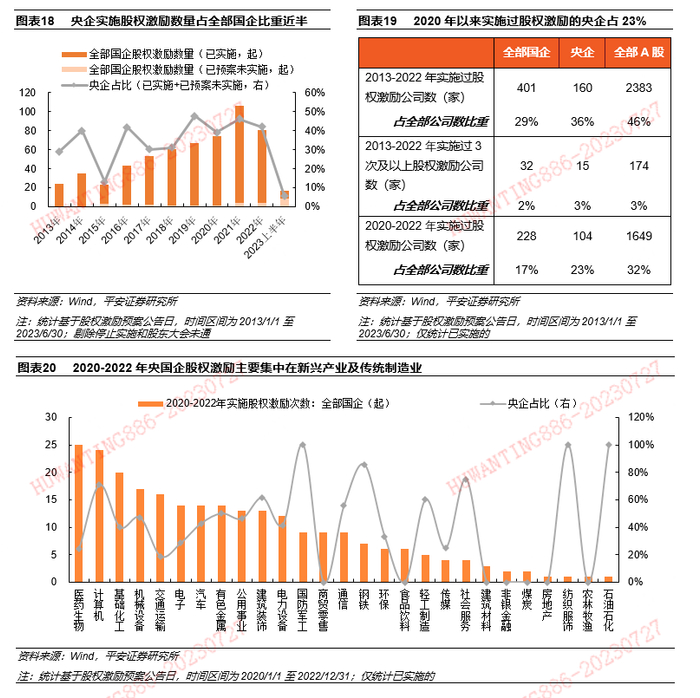 2020-2022年央国企实施股权激励取得重大突破,实施次数超过此前五年合计(2015-2019)。2020-2022年国企改革三年行动期间,央国企实施股权激励的次数明显增多,合计实施股权激励252次,高于2015-2019年合计,其中央企占比约40%;行业分布上,计算机、医药生物、基础化工、机械设备、电子和汽车等制造业和新兴产业实施股权激励的次数较多,煤炭、石油石化、建筑材料、纺织服饰等传统行业较少。相较于全部A股整体,央国企实施股权激励仍有提升空间,2020-2022年全部国企和央企实施过股权激励的公司数占比分别为17%和23%,但全部A股的水平为32%,过去十年全部国企和央企实施过股权激励的公司数占比亦较全A有一定差距。