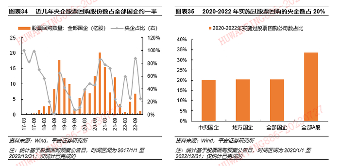 “价值实现”路径二:股票回购。2020-2022年,央国企合计完成股票回购99.3亿股,合计金额达518.8亿元,市值管理和实施股权激励的主动式回购占比近七成。2023年上半年,央国企已发布138项回购预案,预计回购11.8亿股,合计金额达66.4亿元,回购目的主要是股权激励注销。据过去十年市场表现,主动式回购预案日后30日,股价有3~7%涨幅。