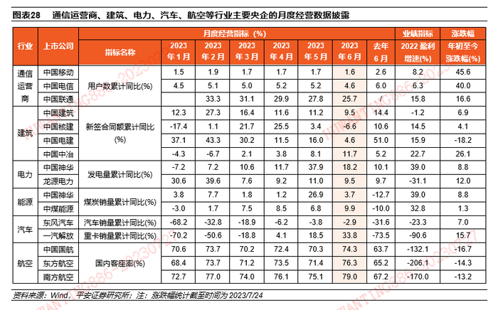 企业高频经营数据指示电力业绩改善确定性更高。通过梳理上市公司公告发现,目前通信运营商、建筑、煤电、汽车以及航空行业的部分央企会定期披露月度经营数据,可用以跟踪央国企业绩表现。具体分析来看:(1)通信行业,1-5月三大运营商经营情况整体平稳,用户数量仍保持稳步增长,最新业绩预期也较5月初有所上修;(2)建筑行业,四家央企建筑商高频经营数据表现有一定分化,中国建筑和中国电建的新签合同额累计同比增速相对稳健,其中中国电建在能源电力的新签合同额同比显著增长,但中国核建和中国中冶的新签合同额增速波动较大;(3)煤电领域,在夏季保供和去年同期低基数的影响下,6月中国神华、龙源电力的发电量及煤炭销售量累计同比增速较一季度上行,且明显高于去年同期水平;(4)汽车行业仍处缓慢修复中,结构性亮点在重卡销售,5月一汽解放的重卡销售累计增速达到18.5%,较去年同期大幅改善,而东风汽车的汽车销量累计同比目前仍在负增;(5)航空业,6月三大航空公司客座率较去年同期明显改善,但仍未修复到2019年同期水平。