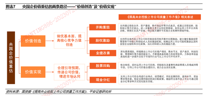 与此同时,今年央国企上市公司在实际经营的微观层面也迎来了诸多变化落地,结合“中特估”建设进一步推动央国企价值重估,主要路径在于“价值创造”和“价值实现”。结合国资委《提高央企控股上市公司质量工作方案》的政策思路和市场讨论,国有企业一方面要做优基本面,另一方面要向市场传递公司价值引导合理定价,兼顾“价值创造”与“价值实现”,其中,“价值创造”是指企业内在价值提升,即“做优基本面、提高核心竞争力”,存量上做强做精主业,增量上引领科技布局和产业升级,涵盖并购重组、股权激励等措施;“价值实现”是指公司价值传递以增进市场认同,涵盖强化投资者管理、股票回购、分红等。