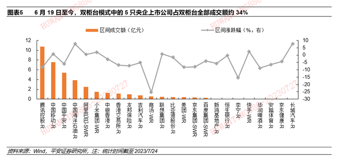 政策层面来看,新一轮国企改革深化提升行动启动在即,六月国资委再提央企上市公司平台并购重组,装备制造、检验检测、医药健康、矿产资源等将是重点领域,港股双柜台机制打通直接投资港股央企渠道。6月14日,国资委召开中央企业提高上市公司质量暨并购重组工作专题会,会议提到“以上市公司为平台开展并购重组”、“锁定提高上市公司质量重点任务”;证监会的相关负责同事也参与了会议,介绍了资本市场监管角度对央企控股上市公司的建议。结合今年2月国资委党委书记张玉卓提到的“2023年在装备制造、检验检测、医药健康、矿产资源、工程承包、煤电、清洁能源等领域推动专业化整合,切实提高产业竞争力”,预计后续相关领域的重组热度有望上升。新一轮国企改革深化提升行动也在加快落地。据7月10日新华社播发《中国证券报》文章《新一轮国企改革深化提升行动启动在即》,目前中国铁建、南方电网等央企以及重庆、广州等地均在积极部署新一轮国企改革深化提升行动,相关改革路线图和行动方案正在制定中;全国国有企业改革深化提升行动动员部署电视电话会议也在近期召开;部分央企领导人员近期也出现新的变动,包括中国宝武、中国电子信息产业集团、中国石化、哈尔滨电气、中国中化、中国融通、中国建筑、中国华能、中国航天科工集团、国家能源投资集团。另外,“港币—人民币双柜台模式”于6月19日正式开通交易,支持人民币直接投资港股市场,目前获批双柜台交易的24只个股中包含5家央企上市公司,分别是中国移动-R、中国海洋石油-R、中银香港-R、华润啤酒-R和联想集团-R,截至2023年7月24日,上述24只个股通过双柜台模式合计成交额达38.5亿元,其中5只央企上市公司合计成交额为13.2亿元,占比34%。
