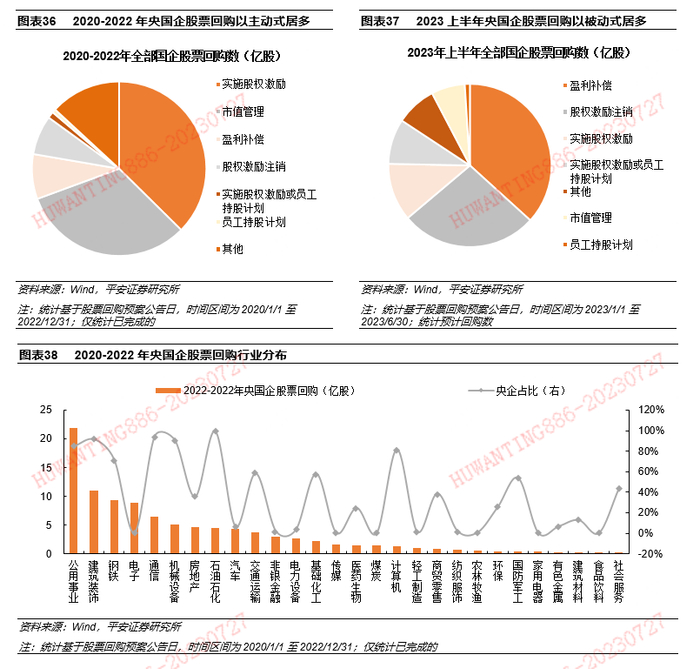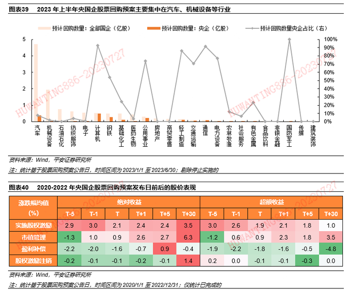 2023年上半年,央国企股票回购规模与过去几年持平,行业结构上汽车、机械设备、石油石化、纺织服饰的预计回购股份数规模呈现增长。2023年上半年,全部央国企已经发布138项股票回购预案,预计回购股份数为11.8亿股,预计回购金额达66.4亿元,持平过去三年平均水平,其中已经完成回购的74项,正在实施的6项,停止实施的1项,央企回购预案数为64项,预计回购股份数为1.9亿股,预计回购金额达15.2亿元。目的来看,股权激励注销和盈利补偿是上半年央国企股票回购的主要目的,回购预案数合计达125项,预计回购股份数占比超60%。行业分布出现明显变化,汽车、机械设备、石油石化、纺织服饰的预计回购股份数规模较大,而过往回购热度较高的公用事业、建筑装饰和钢铁的回购规模回落。