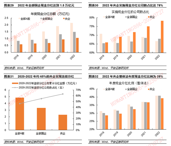 展望后续,在“中特估”体系的建设之下,央国企对市场反馈和股东回报重视度逐步加大,央国企进一步提高分红水平来优化股东回报、传递公司价值的意愿有望增强。数据来看,2022年整体法计算的全部A股、全部国企和央企的年度现金分红比例分别为41%、41%和39%,反映出央企较强的增收创利能力和分红能力,也指示未来央国企分红规模仍有提升空间。