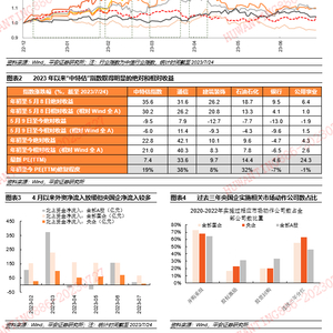 2020-2022年,央国企现金分红规模提升,央企的分红积极性和持续性更高。分红规模上,2022年全部国企的合计现金分红金额达1.5万亿元,其中央企合计现金分红金额达1.1万亿元,分别占全部A股现金分红金额的70%和50%,均较2019年明显增长;行业来看,银行、石油石化、煤炭、通信、交通运输和非银金融等国企浓度较高的行业分红规模较大。分红公司数量上,央企实施现金分红的公司数量占比从2019年的69%上升至2022年的78%,同期全部国企和全部A股实施现金分红的公司数量占比在68%左右;2022年央企现金分红比例高于30%的公司数占比达45%,高于全部A股和全部国企的39%。分红持续性来看,相较于全部A股,央企分红的持续性更为占优,2020-2022三年间,约63%的央企实现连续分红,同期全部A股和全部国企的该比重仅为46%和55%。长期稳定的现金分红优势也为央企吸引了更多的增量资金,2023年以来首批成立并完成募资的三支央国企ETF基金均为央企红利主题,目前已经为市场注入了合计60亿元的增量资金。