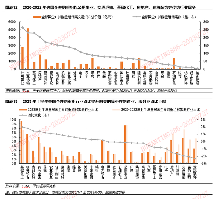 “价值创造”路径一:并购重组。今年以来制造业重组热度上升,6月国资委提出推进央企上市公司平台并购重组;装备制造、检验检测、医药健康、矿产资源、煤电等将是重点领域。2020-2022年,央国企并购重组预案数达2980项,央企826项,公用事业等传统行业居多。2023年上半年,央国企并购重组预案数414项,电力设备、机械设备等制造业重组数量占比上升。过去十年市场表现来看,定增重组对央国企股价有一定短期提振而长期回归基本面,“预案公告日-股东大会审核日”期间平均涨幅达23.4%。