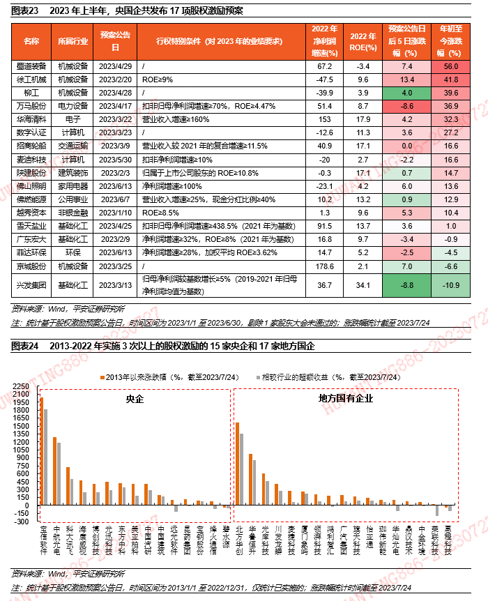 “价值创造”路径二:股权激励。股权激励在过往三年成效显著,相应央国企在ROE和研发创新投入均有改善。2020-2022年,央国企合计实施股权激励252次,高于2015-2019年合计,医药生物、计算机、基础化工、机械设备居多,期间实施过股权激励的国企在ROE和研发创新投入强度均有优势。2023年上半年,全部国企已发布17项股权激励预案,基础化工和机械设备合计达7项。近十年实施3次及以上股权激励共15家央企和17家地方国企,多为行业龙头且近十年平均涨幅呈倍数增长。