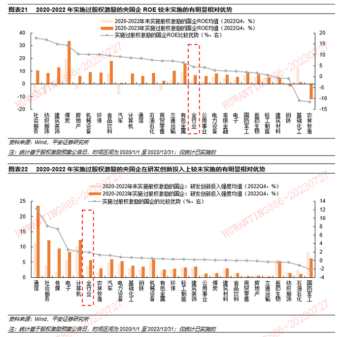 历史经验表明,股权激励是央国企较为有效的公司治理改善的行为,过往三年实施过股权激励的央国企在ROE和研发创新投入均可看到相对优势。理论上,实施股权激励有利于调动企业经营管理骨干和核心科研技术人员的积极性和创造性,进而强化企业内生增长和创新发展,而这一效果在央国企中得到了一定验证。分组统计来看,2020-2022年期间实施过股权激励的央国企的2022年ROE均值为6.7%,同期未实施过股权激励的央国企ROE均值仅为2.4%,且这一优势c在纺织服装、建筑装饰、煤炭、房地产等传统行业中尤为明显;同时,2020-2022年实施过股权激励的央国企在研发创新投入强度方面也有一定优势,且主要体现在通信、传媒、电子、计算机等新兴行业。