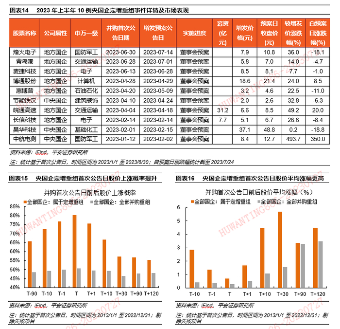 回顾过去十年市场表现,定增重组对央国企股价具有一定短期提振作用。理论上,实施定增重组的上市公司往往是基本面质地较优或重组交易资产价值较高的情况,此时市场更易形成“优质资产注入以强化上市公司成长性”的期待,对股价的影响也更大。分析2013-2022年全部国企的并购重组事件的市场表现可以发现:第一,相较于普通并购重组,定增重组对央国企股价具有一定短期提振效果,重组首次公告日前90日(T-90),属于定增重组的股价上涨概率约66%,但在T-1、T和T+1时的股价上涨概率可达到76%~80%,随后逐步回归基本面,上涨概率回落至55%左右,另外,央国企股价在首次公告日后的平均涨跌幅也高于普通并购重组;第二,分阶段来看,央国企股价在定增重组预案公告日至股东大会审核日前表现最佳,数据显示,央国企股价在“增发预案公告日~股东大会审核日”阶段的涨幅均值和中位数分别可达23.4%和8.6%。