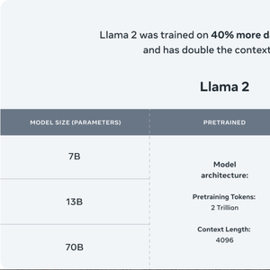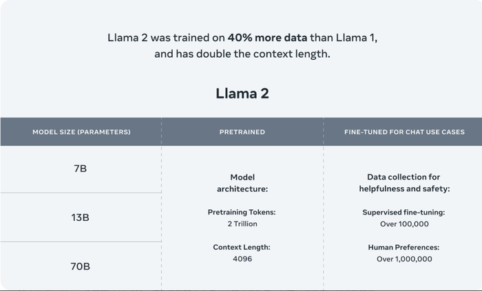 Llama 2是Meta最新的大模型,有70亿、130亿和700亿三种参数规模,其中700亿参数模型能力已与GPT-3.5接近。相较于今年2月发布的Llama1,Llama2训练所用的token翻了一倍至2万亿,同时对于使用大模型最重要的上下文长度限制,Llama2也翻了一倍。