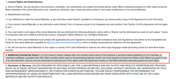 其实,Meta早就确定了策略——对小厂“仁慈”,对大厂“严苛”。在之前的协议中,Llama2虽然允许了商业使用,但是它还添加了一条附加商业条款: