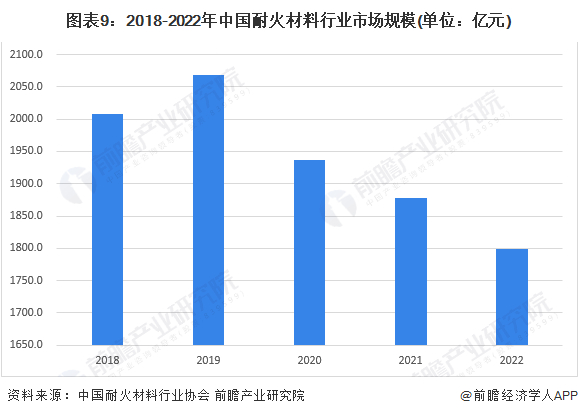 据中国耐火材料行业协会数据,中国耐火材料行业企业主营业务收入由2018年的2008亿元下滑至2020年的1936.4亿元,结合近两年来,中国耐火材料产量情况,前瞻初步统计,2022年,中国耐火材料行业规模为1798.1亿元。