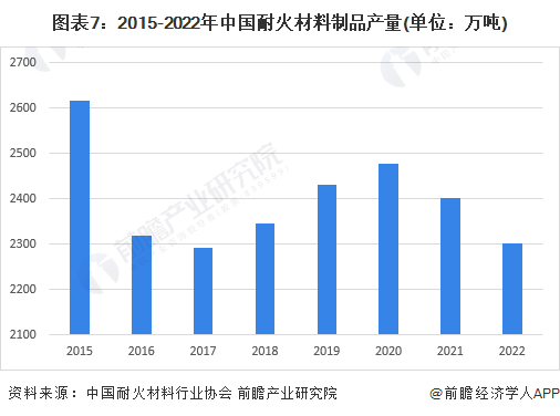 2022年对耐火材料行业是极具挑战的一年,受国际政治和安全形势动荡以及新冠疫情影响,世界经济复苏乏力,耐火材料行业面临市场需求减弱、原材料及能源成本高企、企业利润大幅下滑的多重挑战。据中国耐火材料行业协会统计数据,近年来,我国耐火材料制品产量呈波动下降趋势,2022年,我国耐火材料制品产量为2301.00万吨,同比降低4.23%。