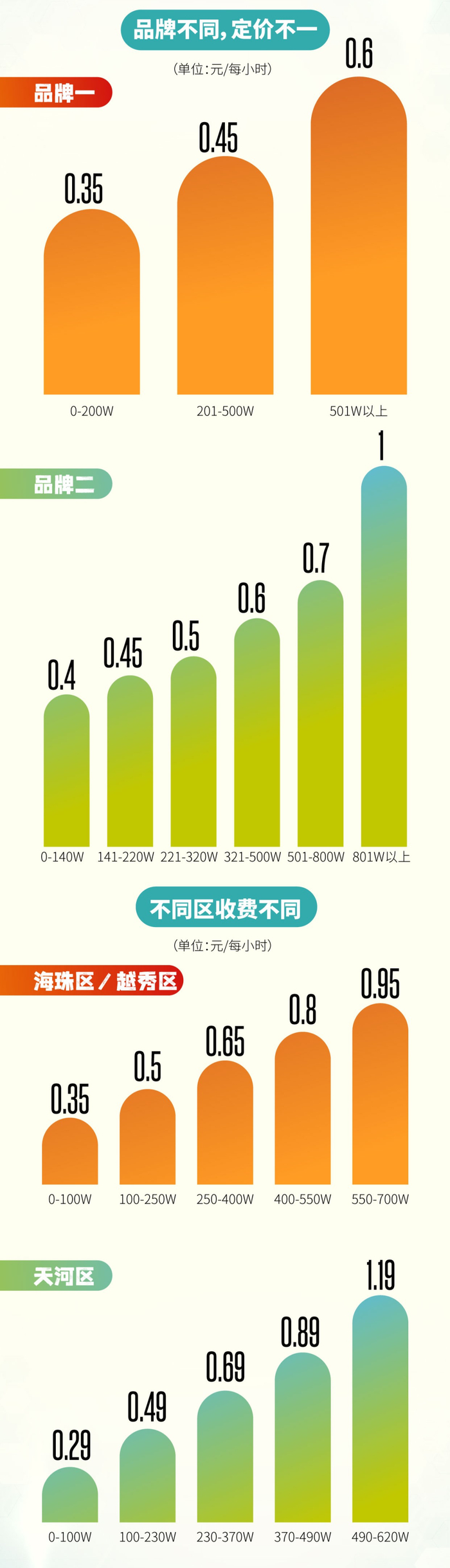 此外,新快报记者还发现,即使同品牌的充电桩在不同区域也区别收费。小安充电在天河区和越秀区、海珠区的资费就存在差价。在海珠区和越秀区的充电桩,0-100W每小时0.35元,100-250W每小时0.5元,250-400W每小时0.65元,400-550W每小时0.8元,550-700W每小时0.95元。而在天河区的低功率充电桩,0-100W每小时0.29元,100-230W每小时0.49元,230-370W每小时0.69元,370-490W每小时0.89元,490-620W每小时1.19元,620-760W每小时1.39元;高功率充电桩0-750W每小时0.95元,750-1050W每小时1.45元。
