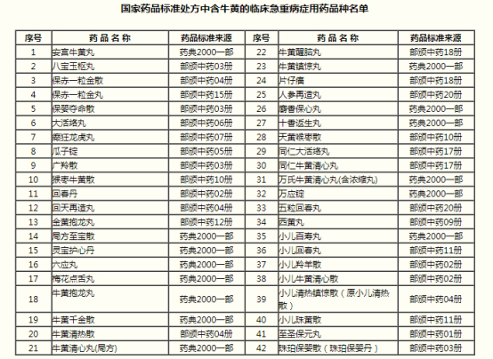必须使用天然牛黄、培植牛黄或体外培育牛黄的中成药品种(图片来源:《国家食品药品监督管理局关于牛黄及其代用品使用问题的通知》)